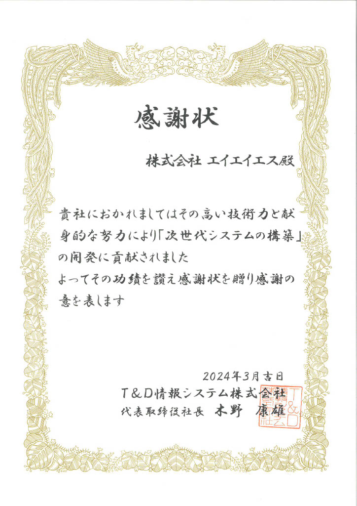 弊社のシステム開発への貢献を讃えて感謝状を頂きました。
